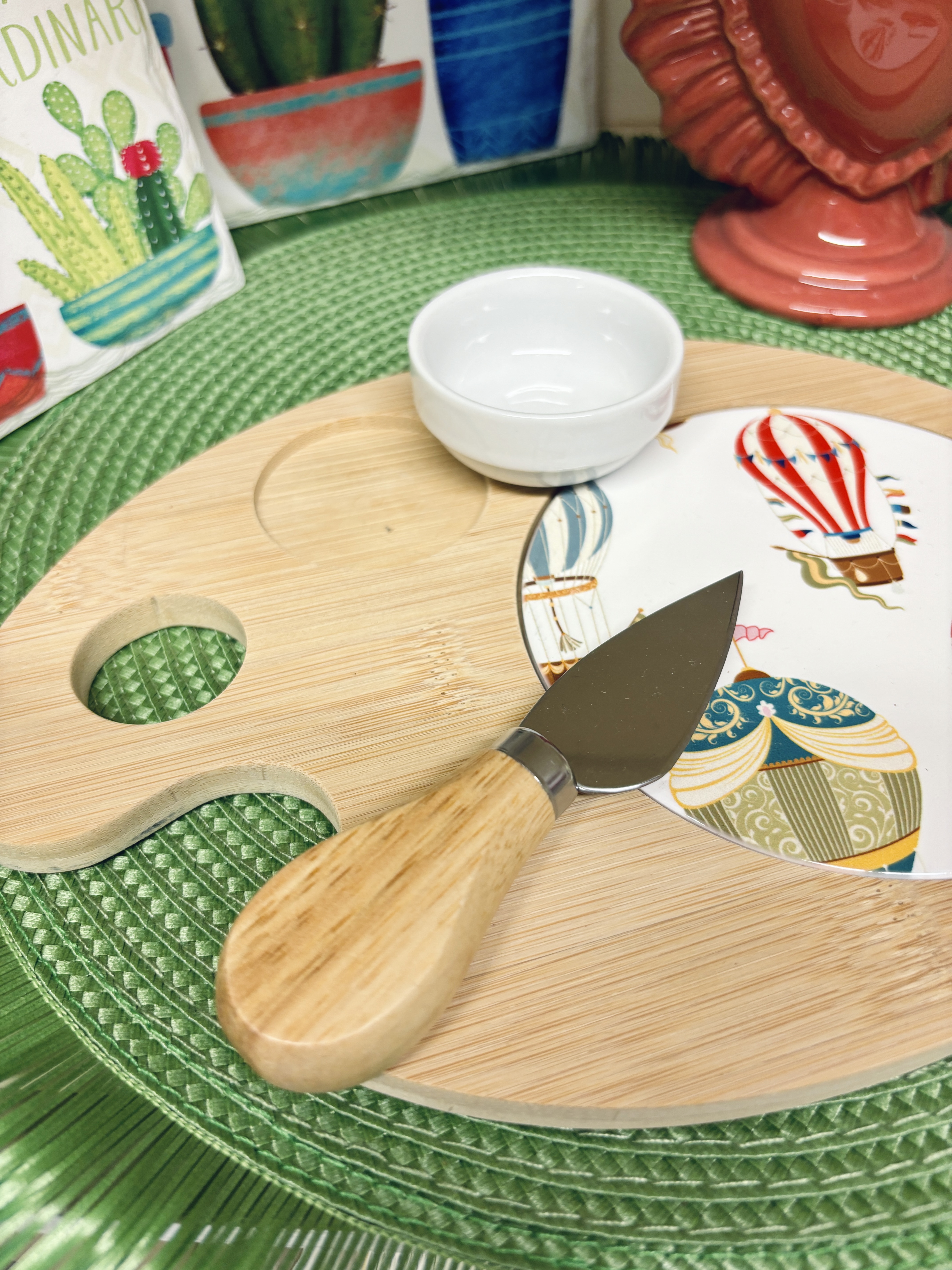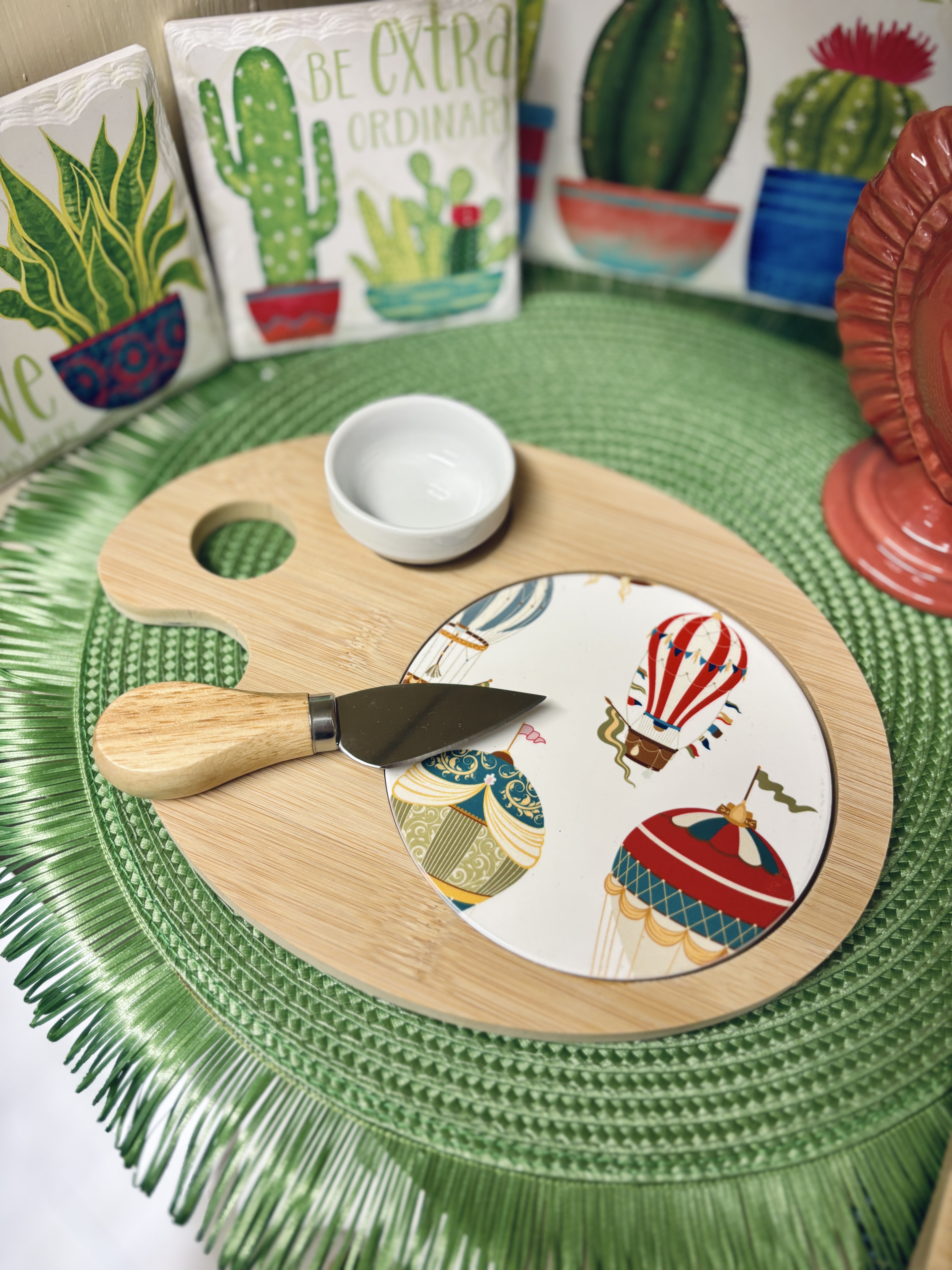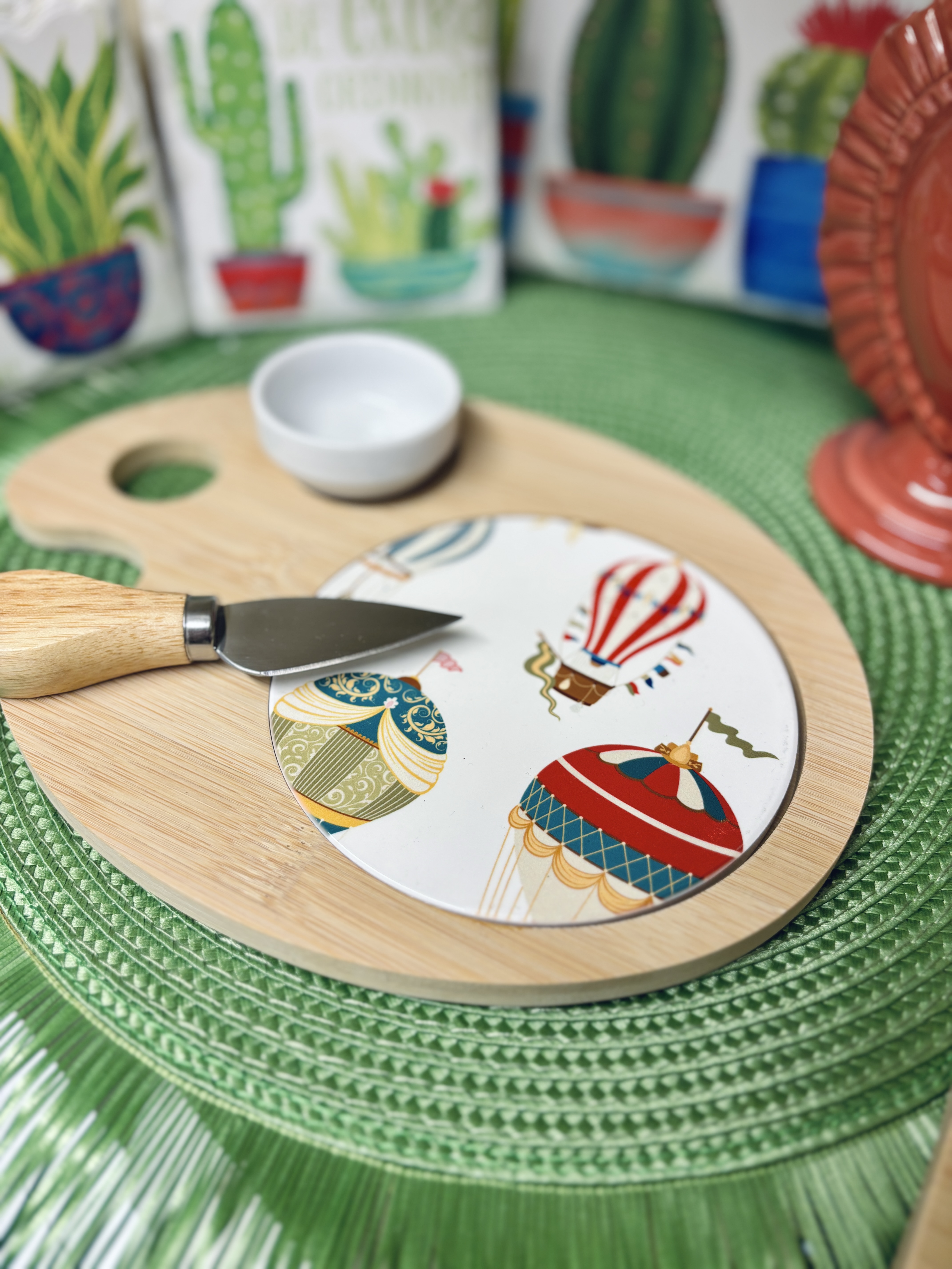 Tagliere misura media con fantasia mongolfiere su piastrella in ceramica. Provvisto di scodellina e coltello taglia formaggi.
