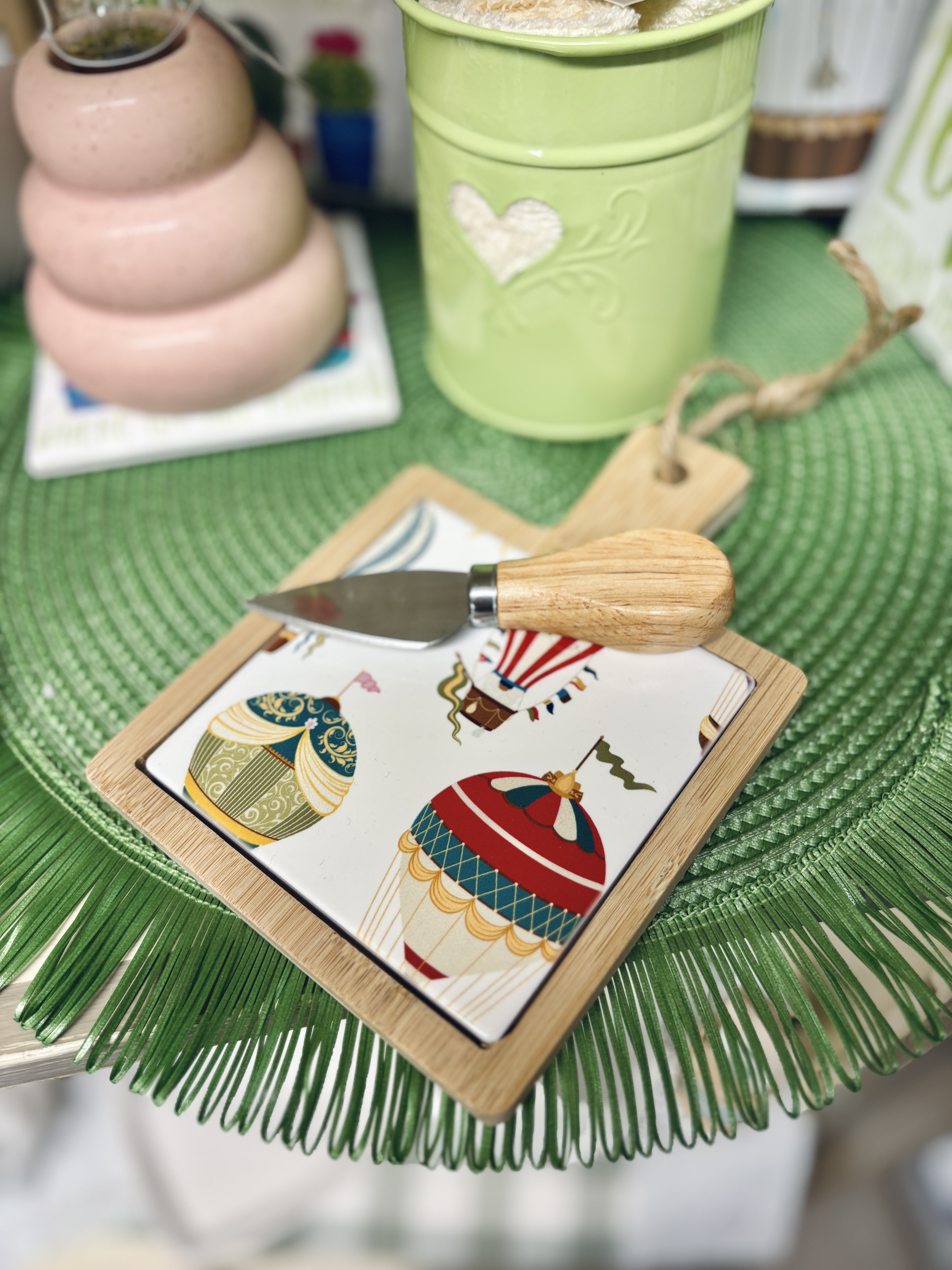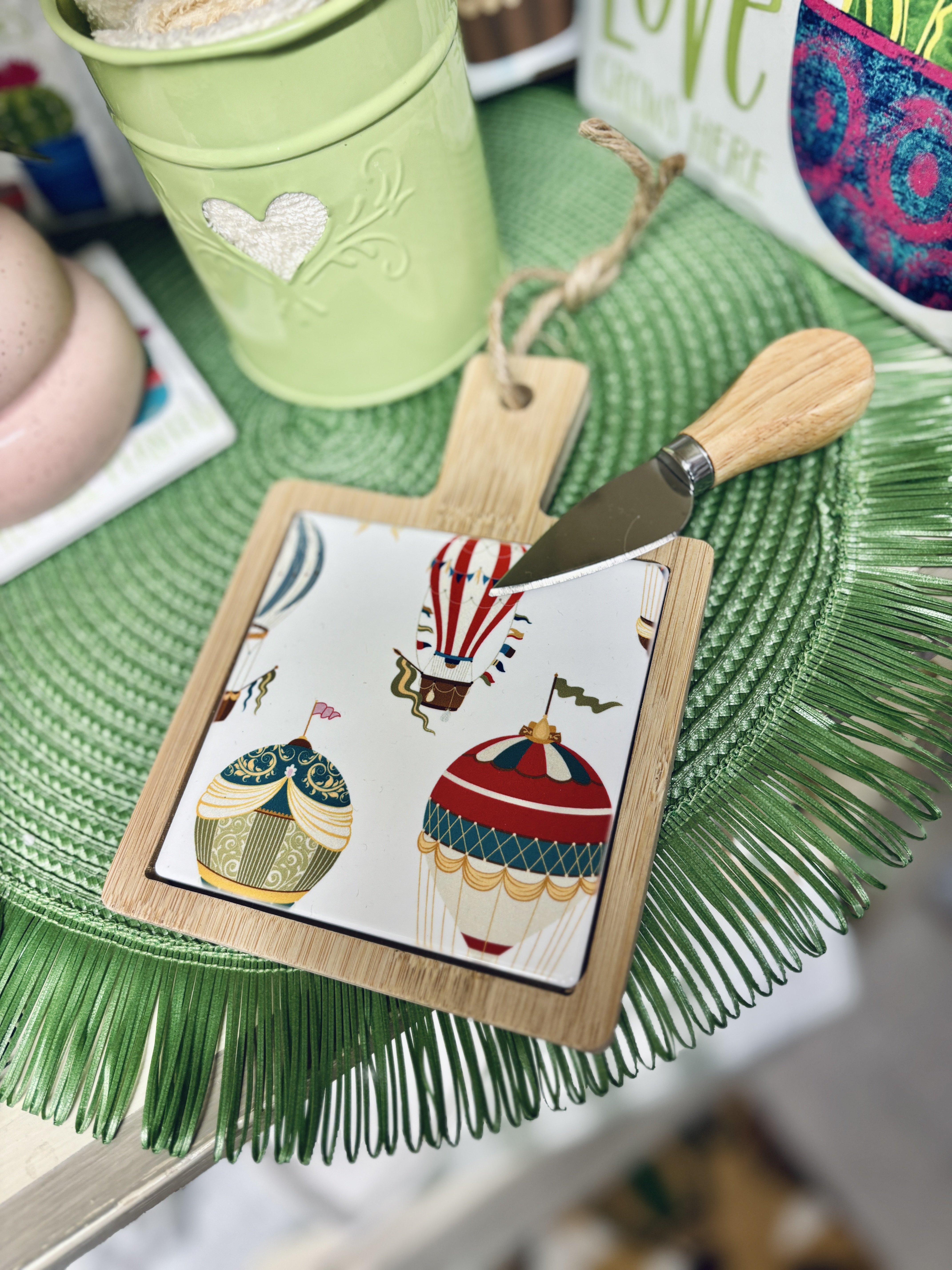 Tagliere misura piccola con fantasia mongolfiere su piastrella in ceramica. Provvisto di coltello taglia formaggio.