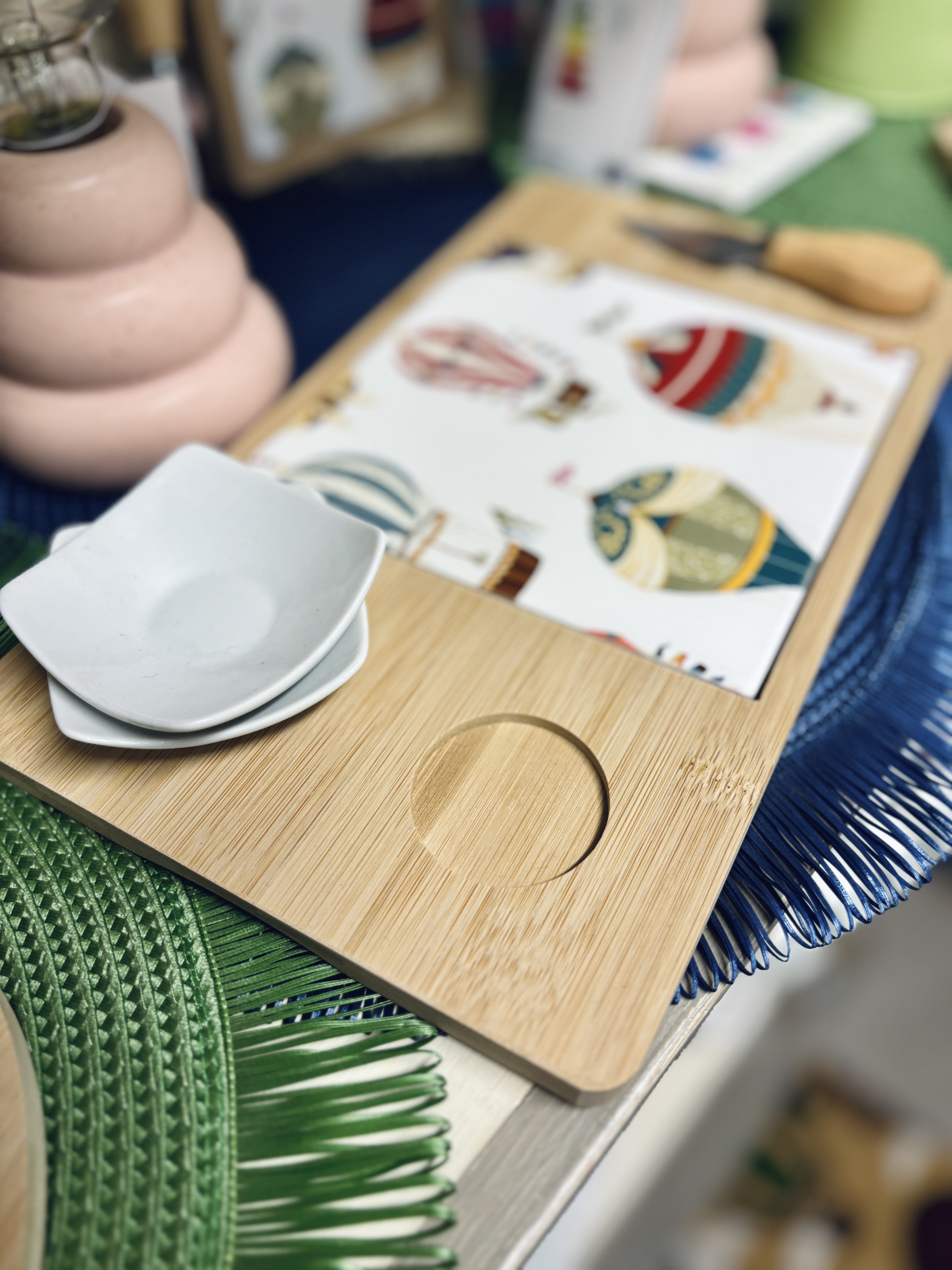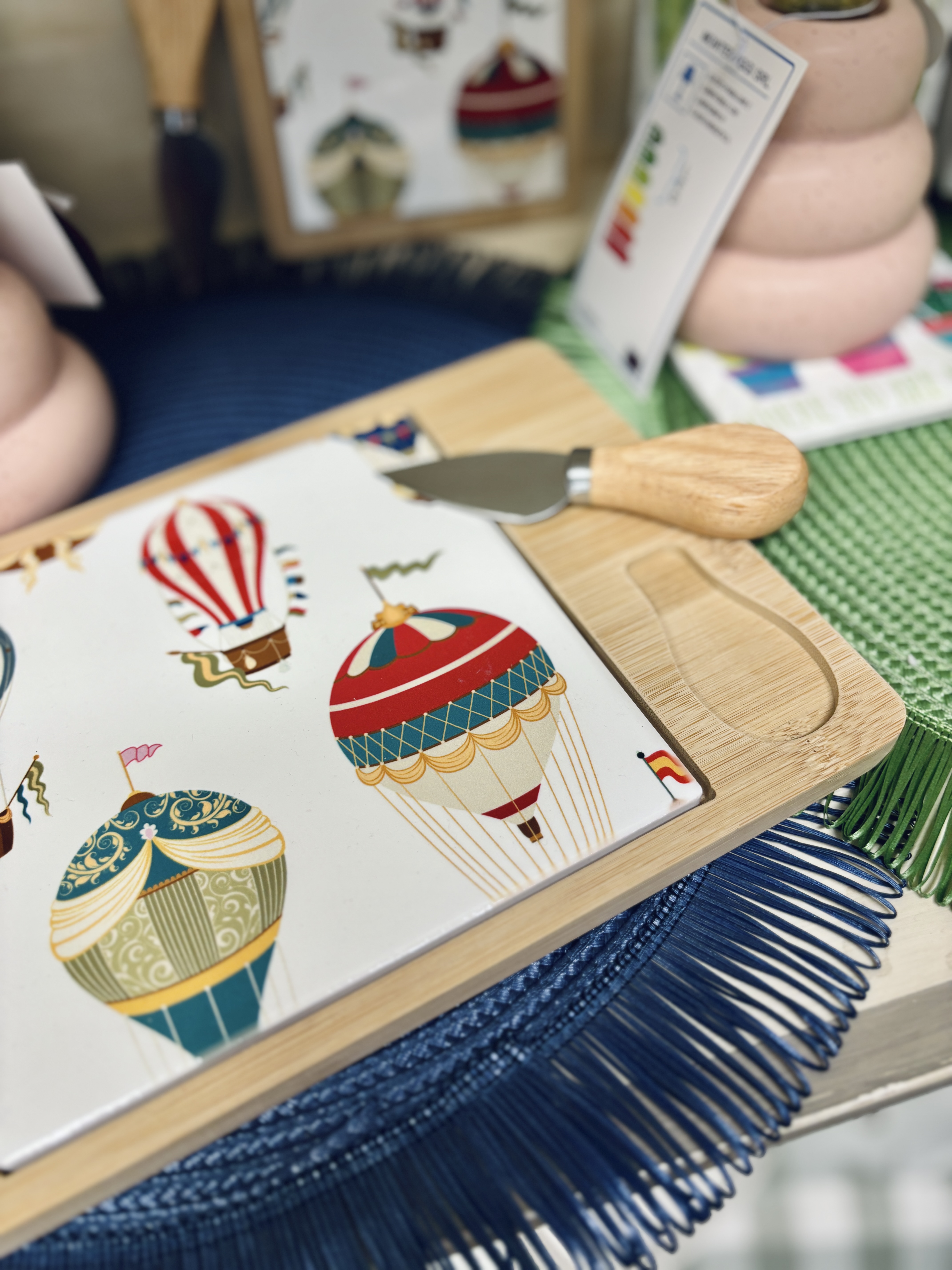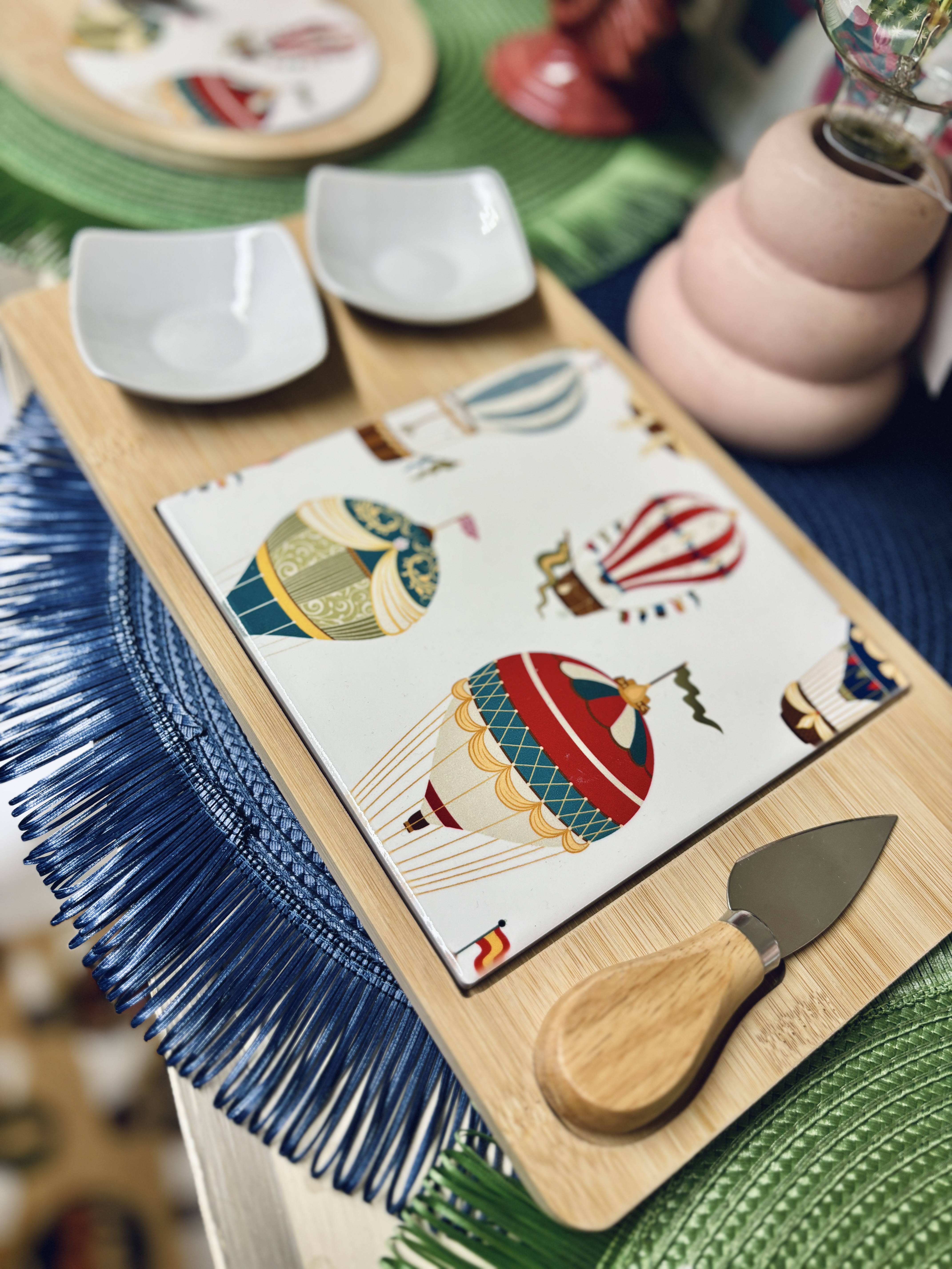 Tagliere misura grande con fantasia mongolfiere su piastrella in ceramica. Provvisto di coppia di ciotoline e coltello taglia formaggio.