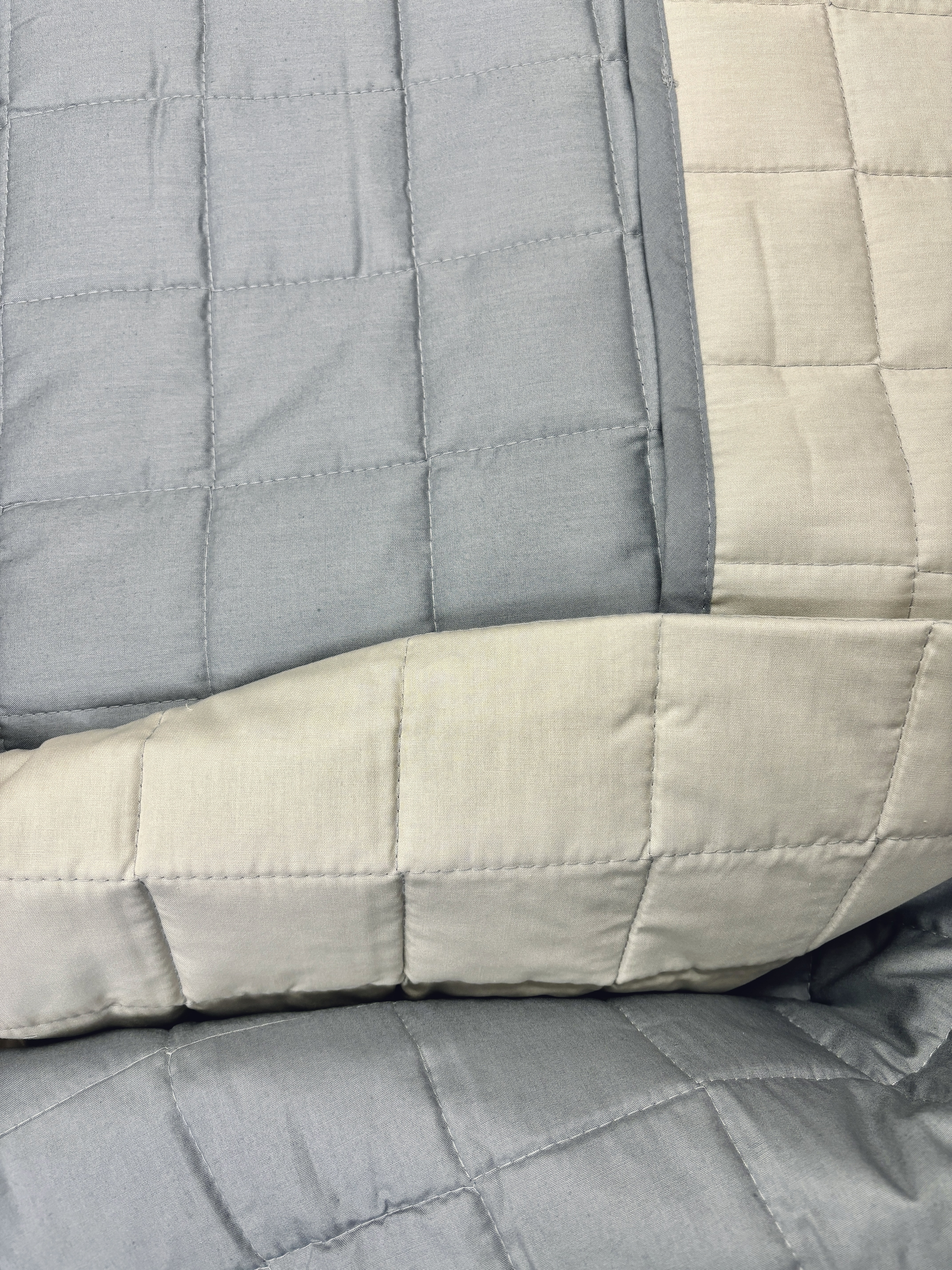 Copriletto leggermente trapuntato 100g matrimoniale 100% cotone. Double-face: tinta unita grigio da un lato, tinta unita beige/sabbia dall'altro.