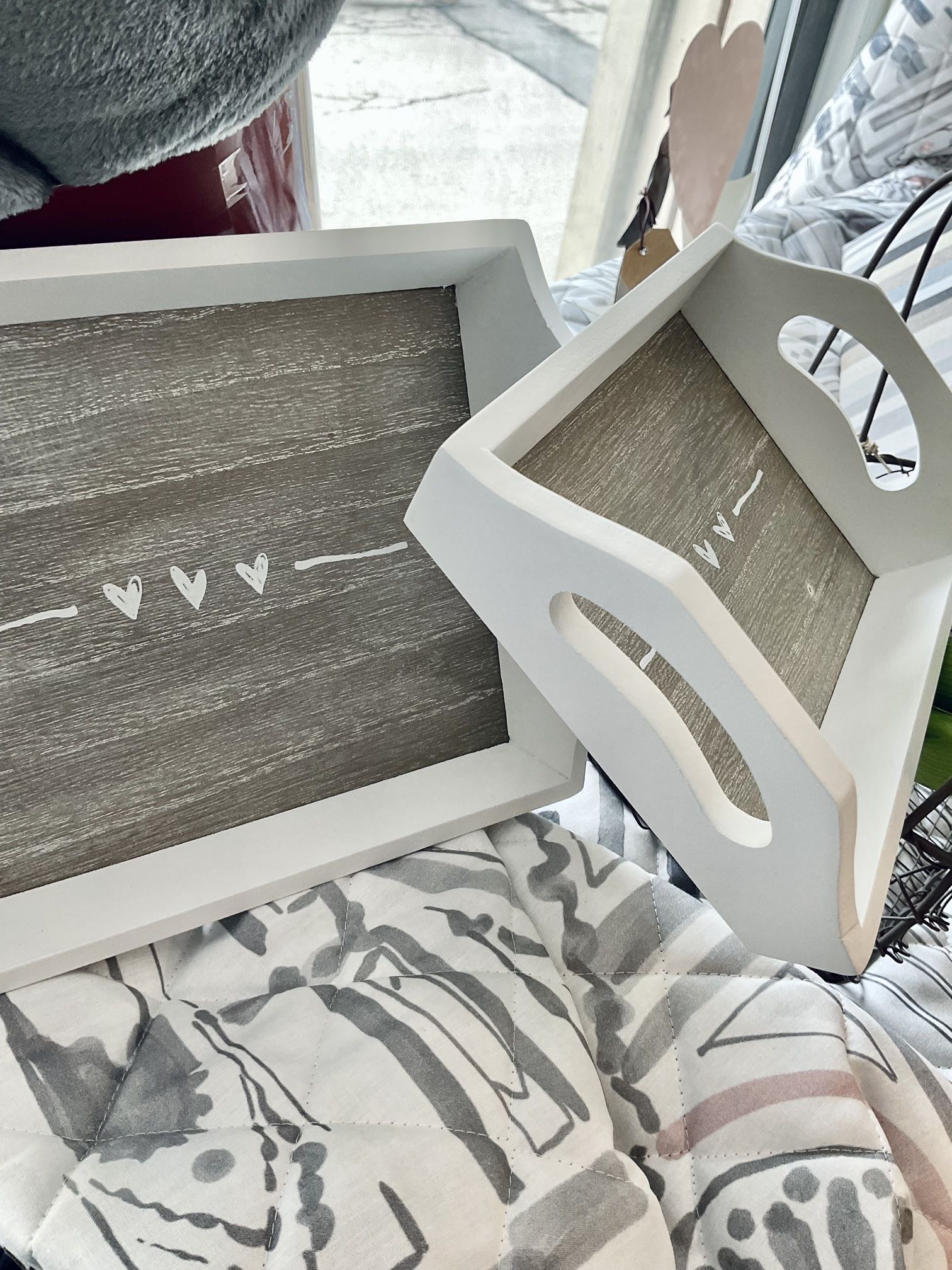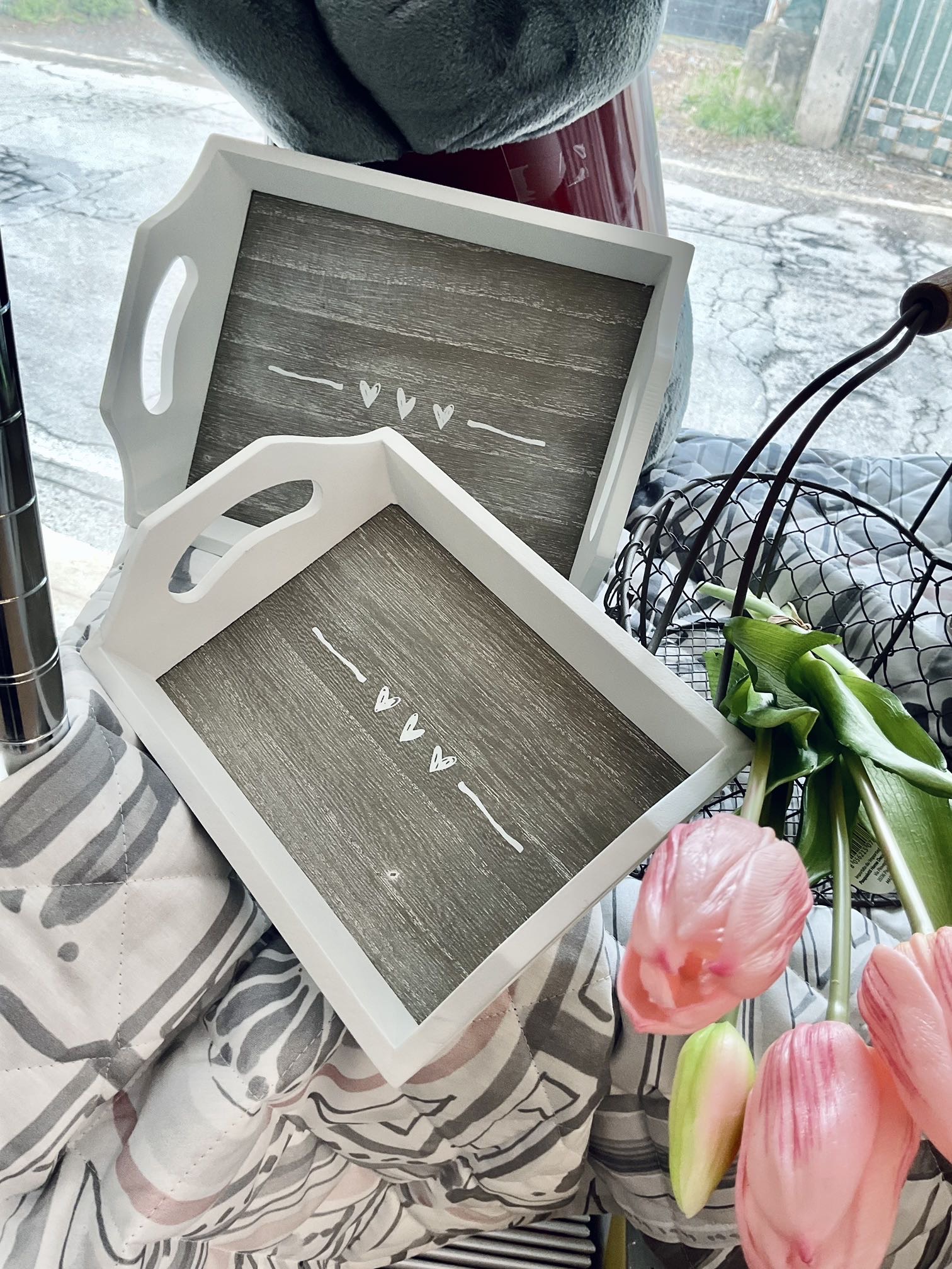 Coppia di vassoi con manico e stampa cuoricini. Prezzo al singolo vassoio